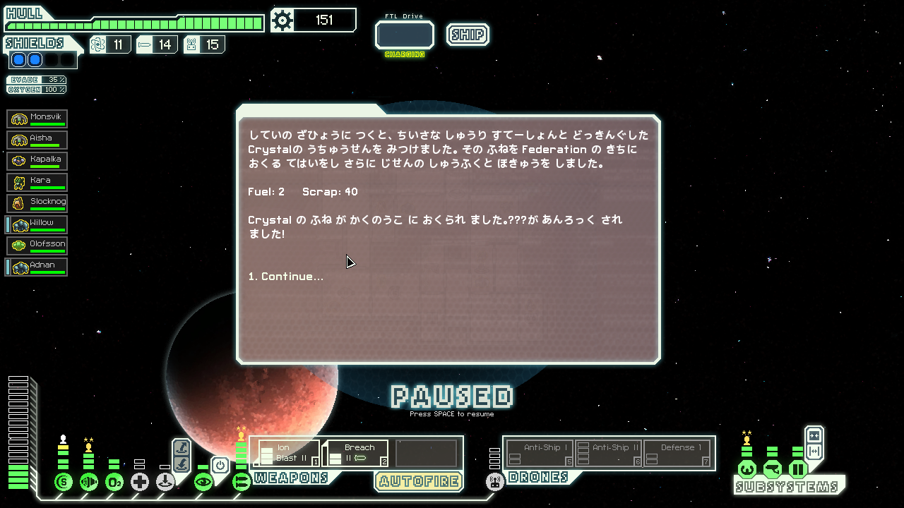 エンディング時のクルーはMantis、Slug、Zoltan×2、Engi×2、Crystal×2。